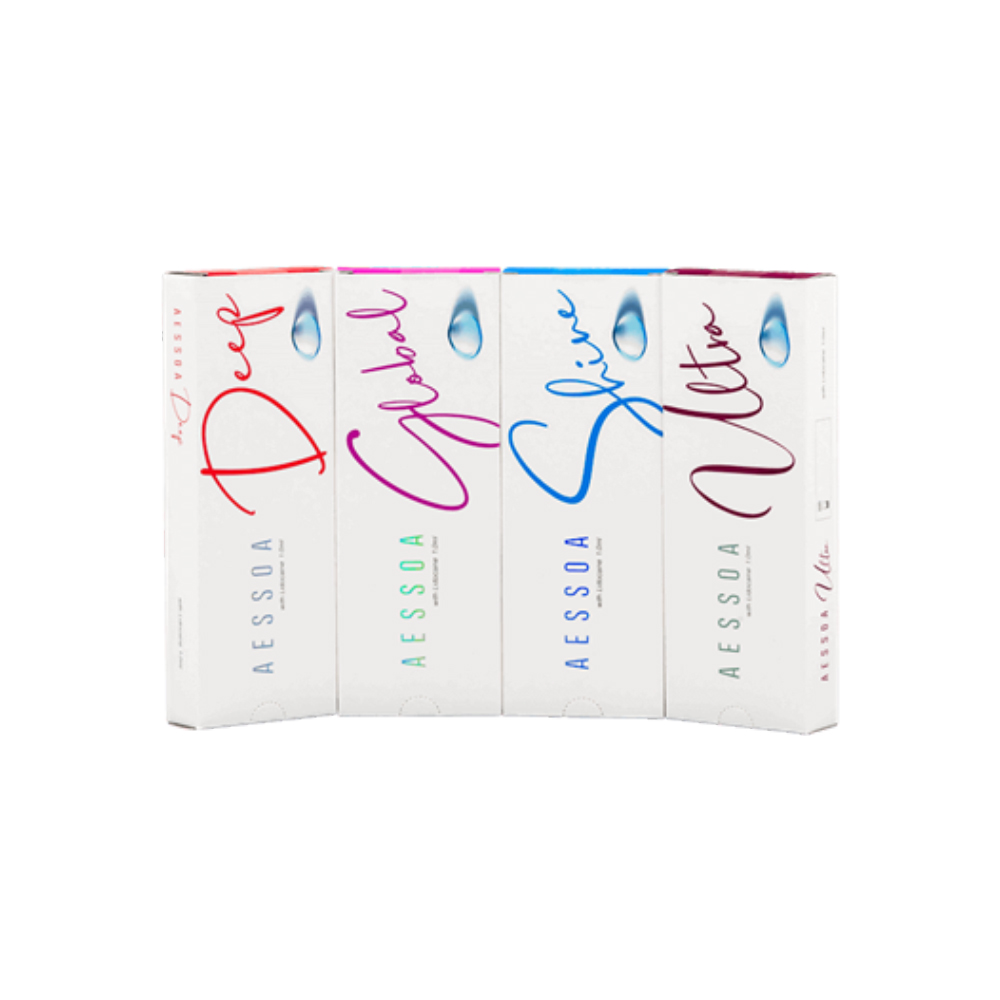 Aessoa dermal fillers are among the most extraordinary injectable filler collections on the market. The safest and most effective cosmetic results are achieved by combining 0.3% lidocaine with 24 mg/mL of monophasic cross-linked hyaluronic acid, which is produced using cutting-edge technology in Aessoa. With the help of Aessoa Dermal Fillers, the facial structure is expertly sculptured, becoming more proportionate and balanced. It includes the proprietary injectables Shine, Global, Deep, and Ultra. Their purpose is to make the skin look smoother and younger by filling in volume, smoothing out superficial to deep wrinkles, and improving and restoring the skin’s quality.